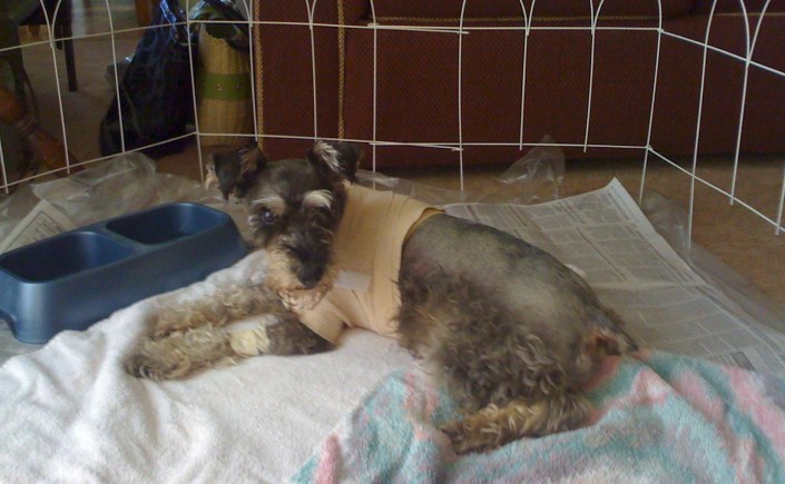 While I was at the conference, Suzanne, our 3 kids and our miniature schnauzer Dusty were with her folks in Macon. Tim and I had just gotten on the Florida Turnpike headed home when I received a call from Suzanne in complete hysterics. I quickly pulled the van to the shoulder and my heart began to race. Something was dreadfully wrong but I couldn’t understand her because she was so upset. The first thing I could understand was, “Don’t move him!” Instantly, my mind created a scenario that my son Ethan had been horribly injured or killed. My heart rate shot through the roof. Finally, Suzanne was able to tell me that it was actually our dog Dusty that had been injured. He was brutally attacked by a stray German Shepherd my in-laws were keeping in their yard until they found a home for it. It took Suzanne, her dad and her brother nearly 2 minutes to get Dusty freed from the jaws of the other dog. They broke patio furniture over its back and it just would not let go. Finally, they grabbed a large patio umbrella and after two good licks, the dog let go.